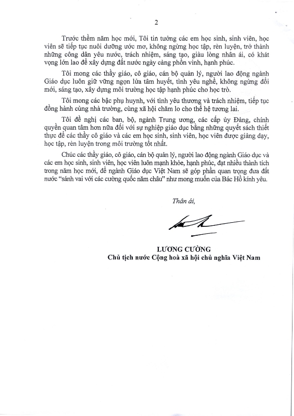 Thư của Chủ tịch nước gửi ngành Giáo dục nhân dịp khai giảng năm học 2025-2026