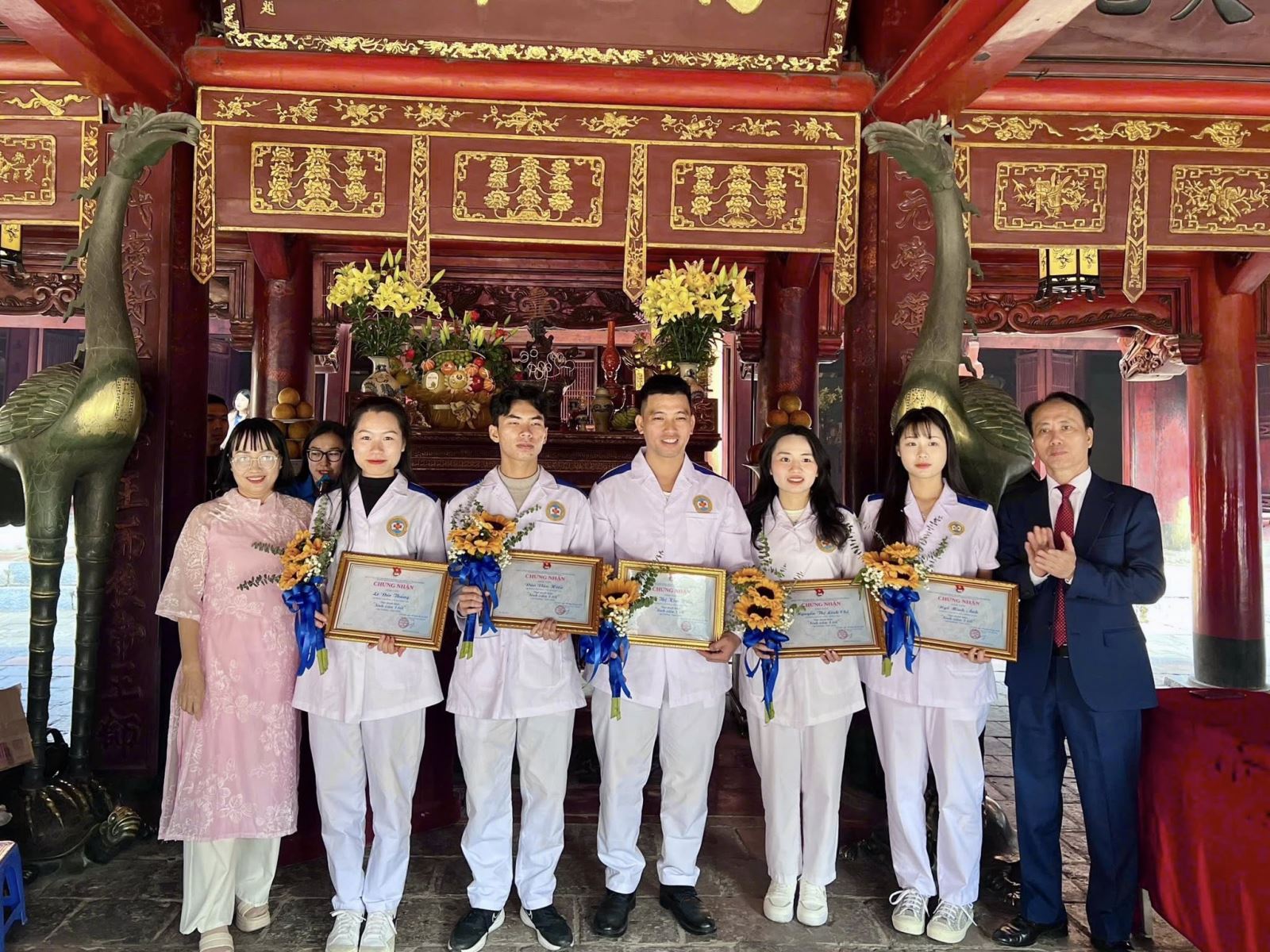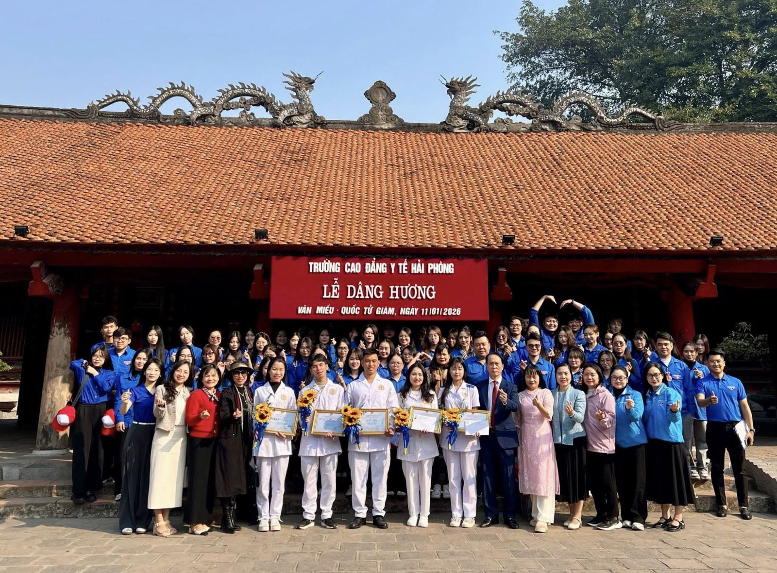 Tiếp nối hành trình là lễ vinh danh Sinh viên 5 tốt được tổ chức tại Văn Miếu – Quốc Tử Giám, biểu tượng thiêng liêng của truyền thống hiếu học và tôn sư trọng đạo. Những sinh viên ưu tú của Trường Cao đẳng Y tế Hải Phòng được tuyên dương là kết quả của quá trình phấn đấu bền bỉ, rèn luyện toàn diện trên các tiêu chí: đạo đức tốt – học tập tốt – thể lực tốt – tình nguyện tốt – hội nhập tốt. Đây không chỉ là niềm tự hào của cá nhân sinh viên mà còn là minh chứng cho hiệu quả các phong trào do Đoàn Thanh niên nhà trường triển khai.