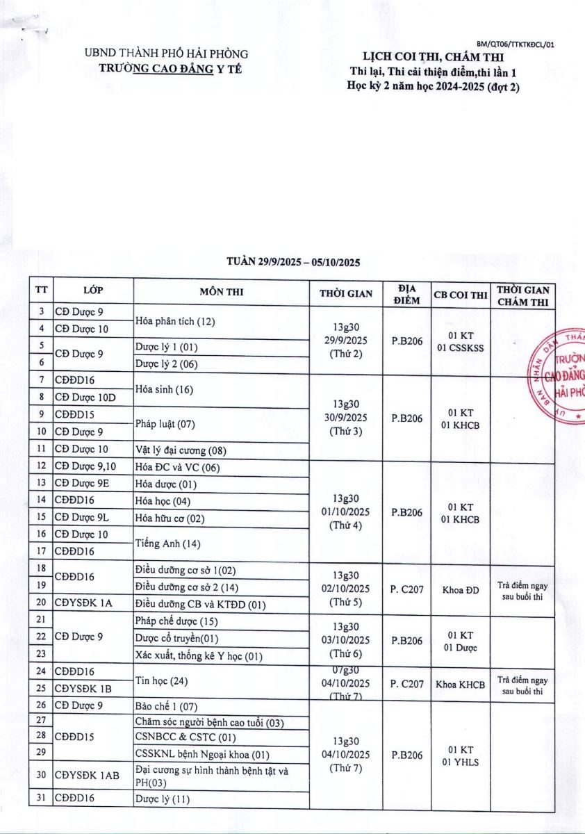 Lịch Thi kết thúc học kỳ 1 năm học 2025-2026 (Từ 22/9/2025 - 28/9/2025)