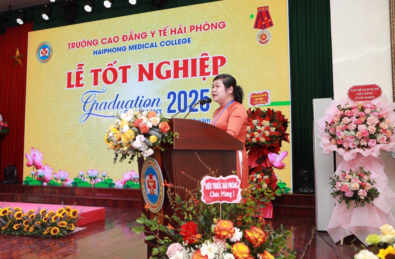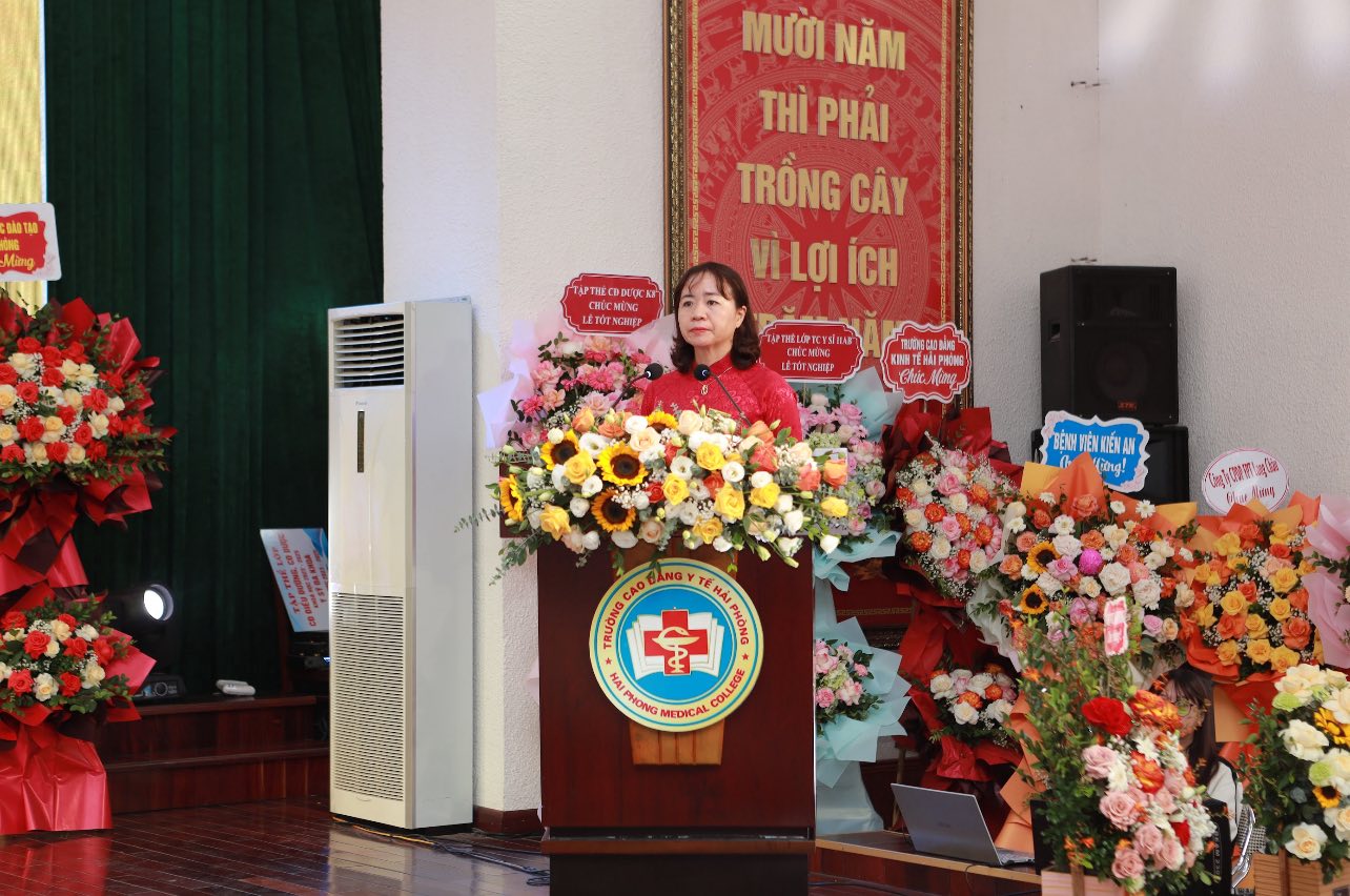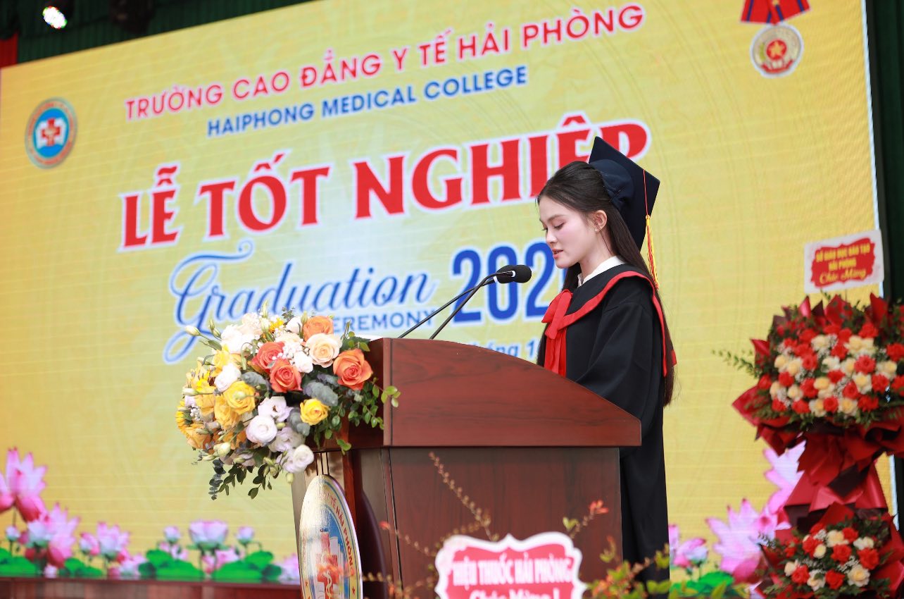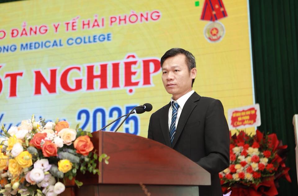 Đại diện Sở Y tế Hải Phòng, TS.BS Phan Huy Thục – Phó Giám đốc Sở, biểu dương thành tích đào tạo của Nhà trường và chúc mừng các tân cử nhân, y sĩ, dược sĩ. Đồng thời, nhấn mạnh vai trò của đội ngũ cán bộ y tế trẻ trong công cuộc hiện đại hóa, chuyển đổi số ngành y tế thành phố, ông Thục bày tỏ mong muốn các em giữ vững y đức, học tập suốt đời, hành nghề bằng trái tim nhân ái – đúng như lời dạy của Chủ tịch Hồ Chí Minh: “Lương y như từ mẫu”.
